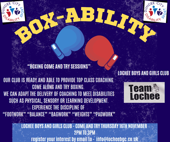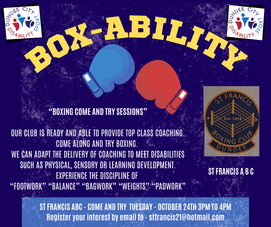 2 clubs in Dundee St Francis ABC and Lochee Boys and Girls Club are coming on board to offer people with disabilities the chance to come along and experience the discipline of :